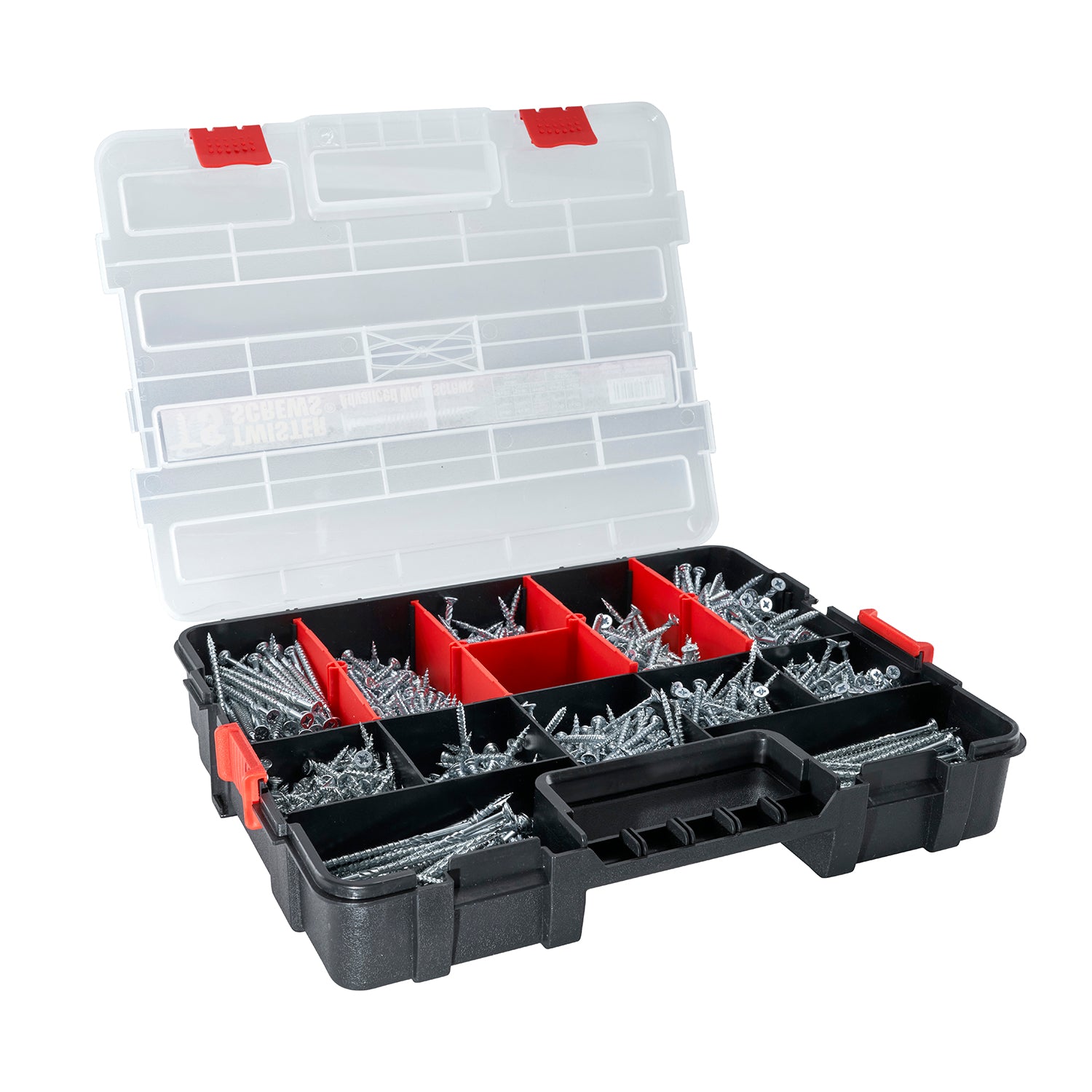 Enhance your woodworking expertise with our patented wood screws! Our versatile box contains 1280 screws of different sizes, all conveniently stored in a robust plastic case.